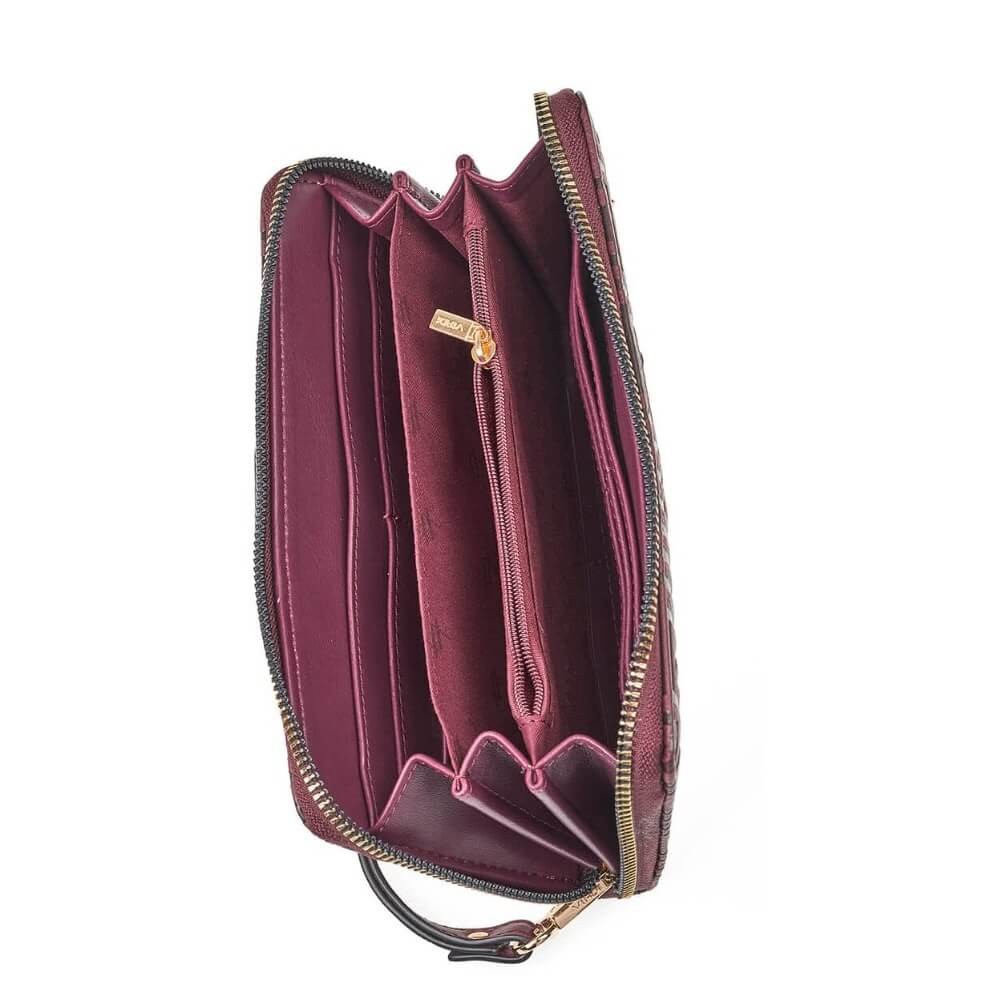 . It consists of two main compartments, one with a zipper and the other with a clutch closure.