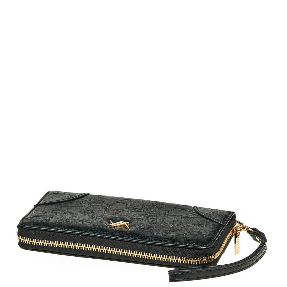 . It consists of two main compartments, one with a zipper and the other with a clutch closure.